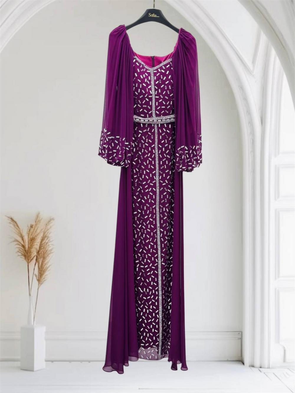 فستان TU10 فوشي 40 فستان سهرة طويل مع أكمام